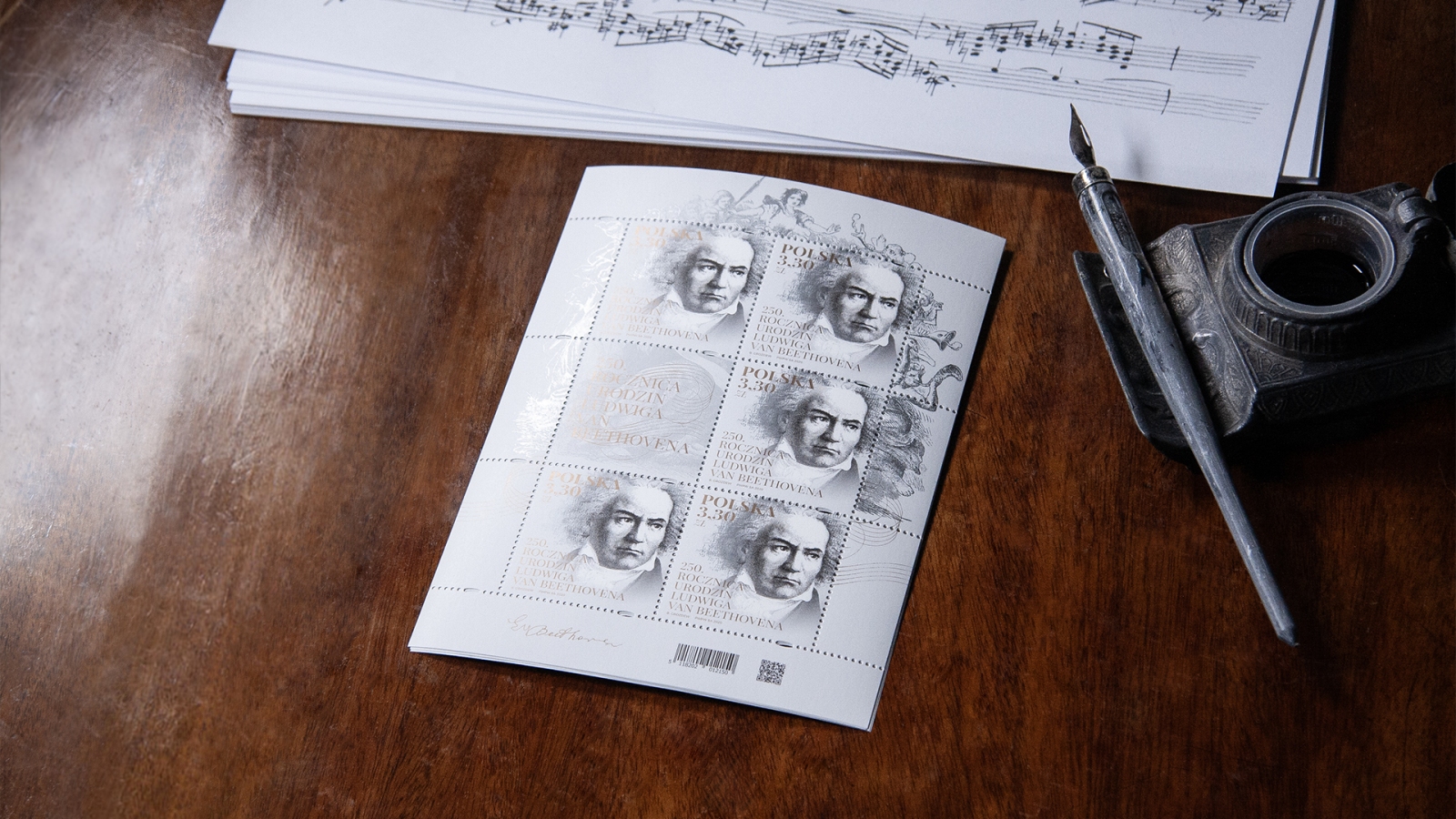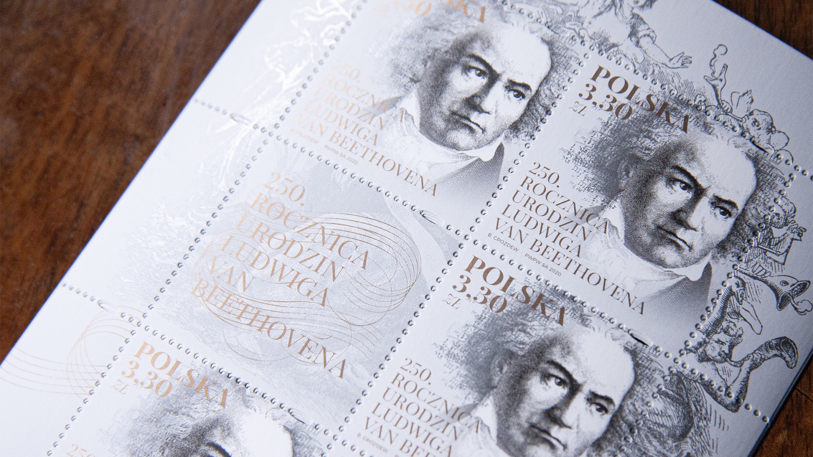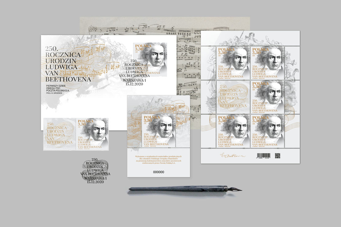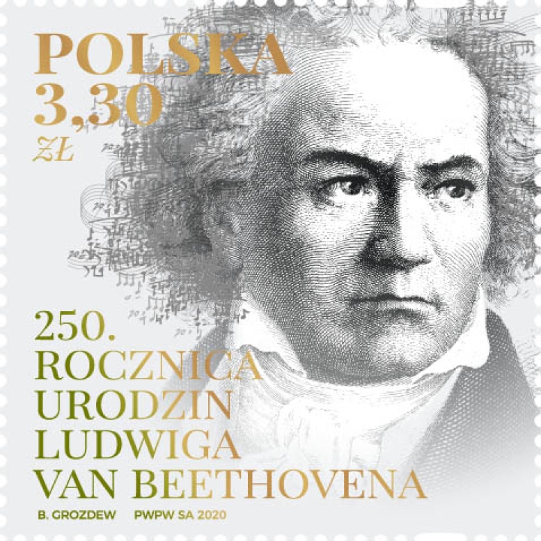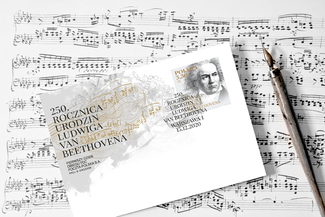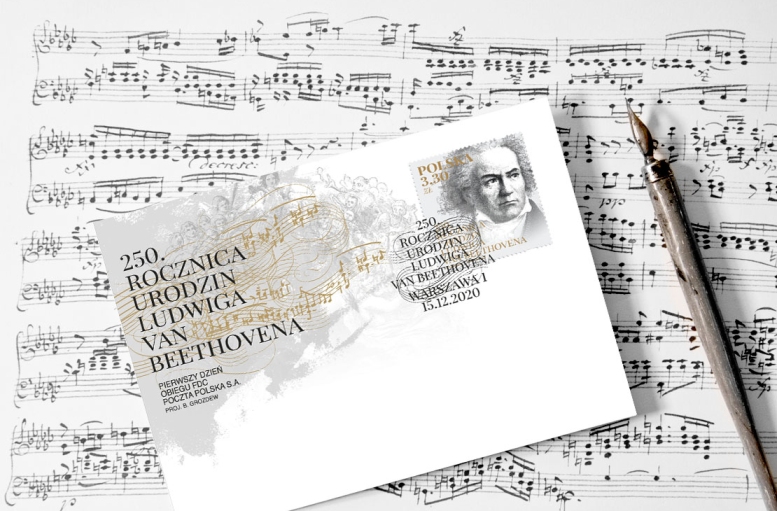 On December 15, 2020, Poczta Polska issued a stamp commemorating the 250th anniversary of the birth of Ludwig van Beethoven. In the limited edition, it was possible to purchase an envelope and a sheet of stamps. Notes, a staff, and images were used to create an allegory of music that floats on Beethoven's hair.