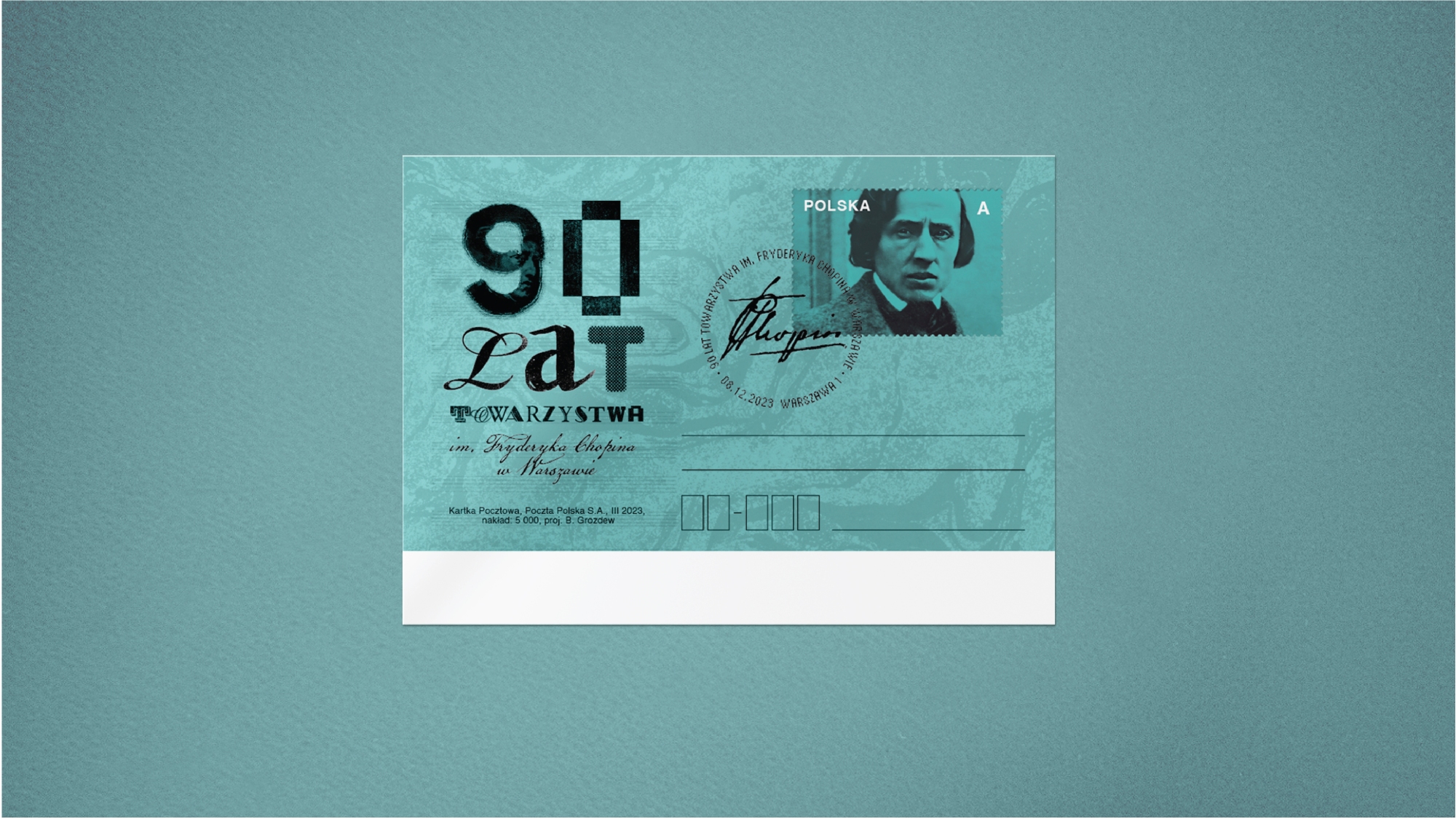On April 11, 2024, the Chopin Society in Warsaw celebrated its 90th anniversary. Poczta Polska commemorated this event by issuing a postcard. The card's illustrations include the inscription "90 Years of the Fryderyk Chopin Society in Warsaw," combining various fonts over the years.